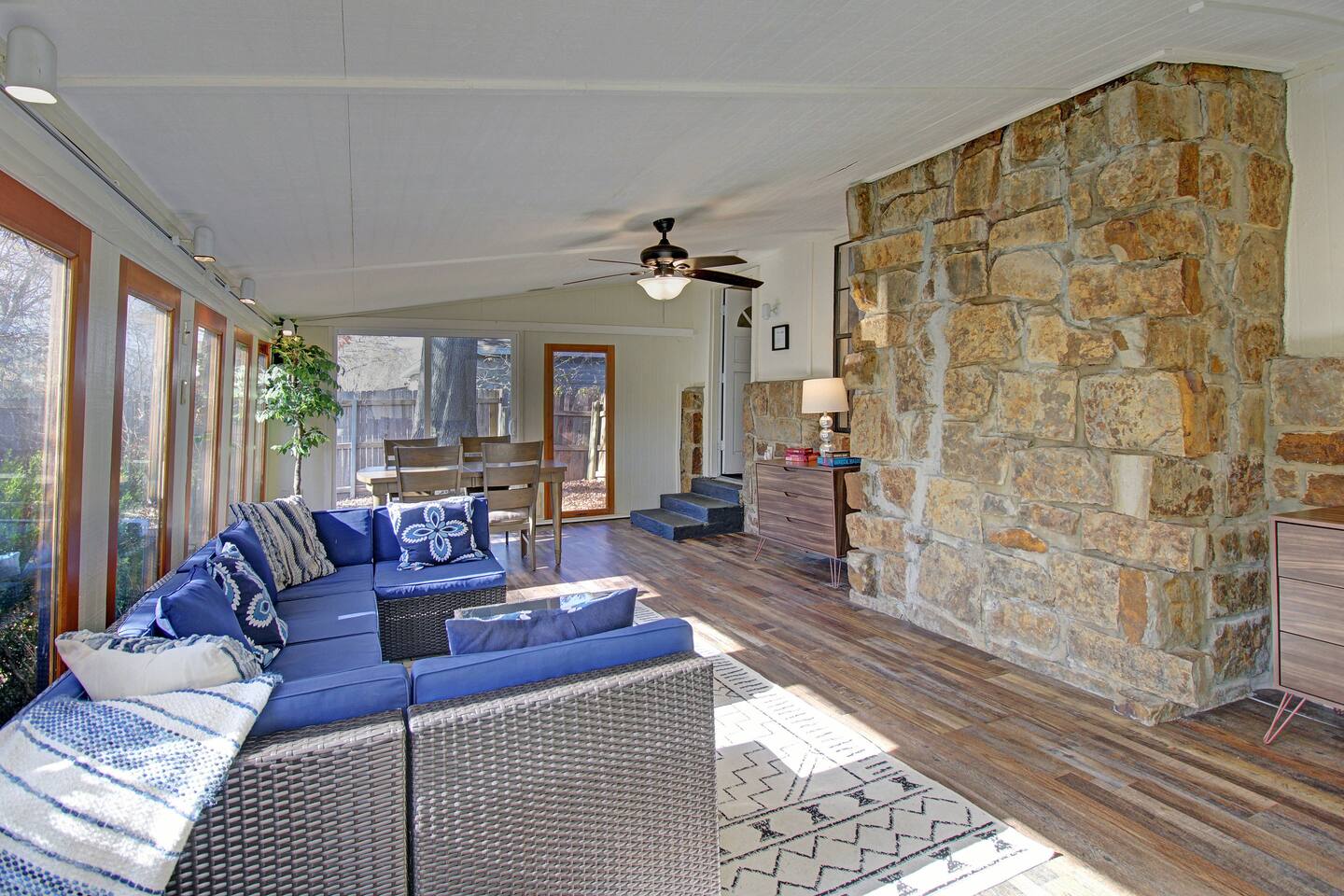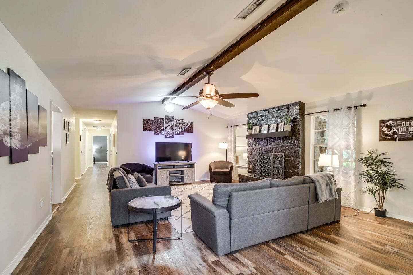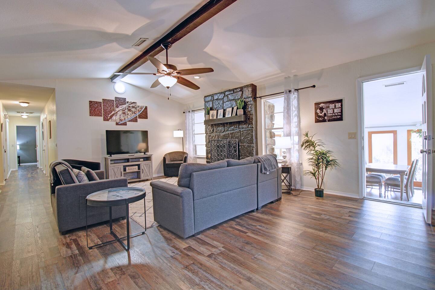 Security: For your safety and the security of the property, there are 4 exterior security cameras facing outward and a Ring Doorbell at the front entrance. These devices record video and audio when motion is detected. An indoor noise monitoring device is also present; it measures decibel levels to ensure compliance with noise policies but does not record conversations. Accessibility: The home features step-free entry. However, please be aware that there are interior steps required to access Bedroom 3 and the sunroom. Fireplace & Fire Pit: The indoor fireplace is decorative and not available for guest use. You are welcome to use the outdoor fire pit in the backyard.