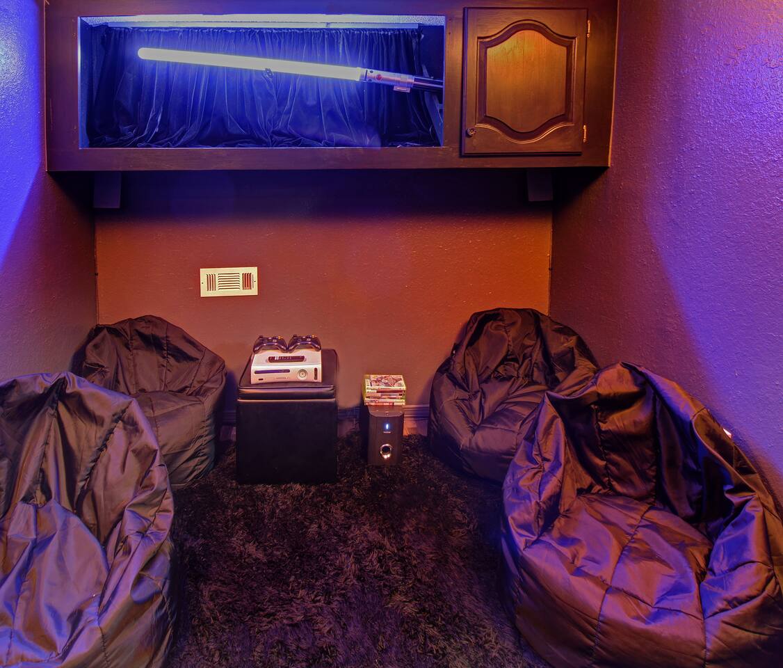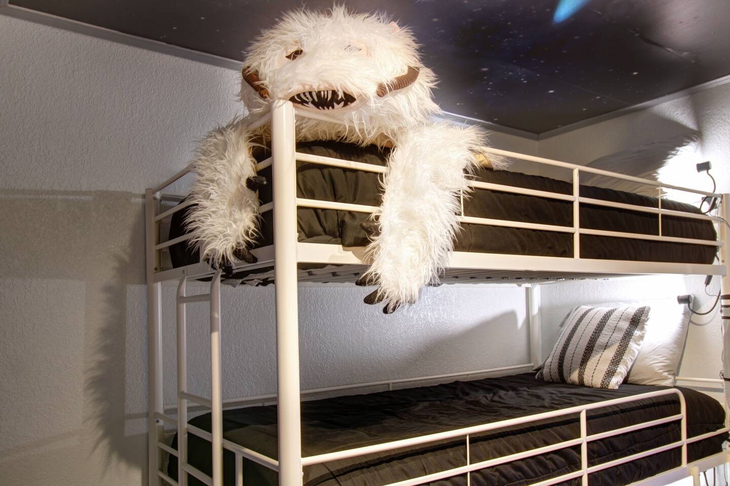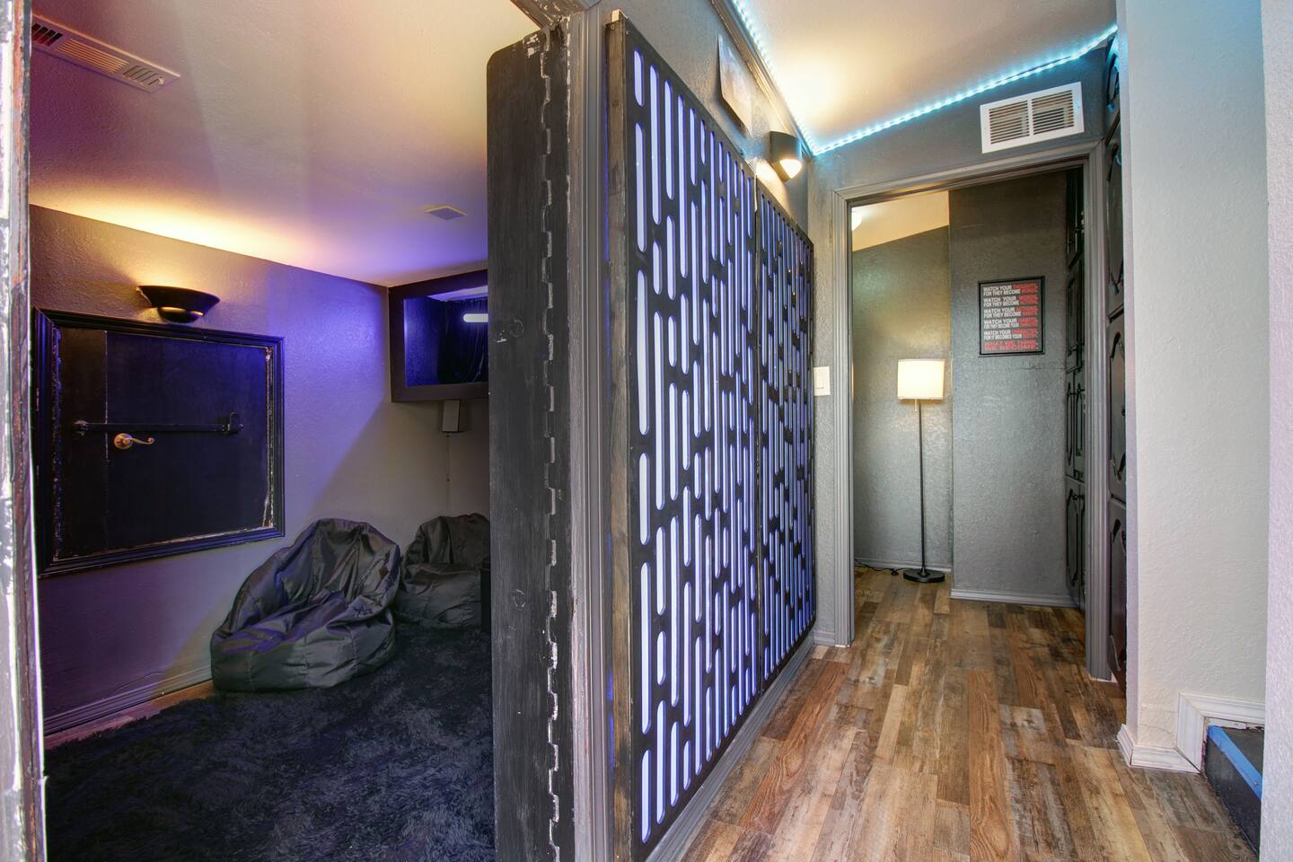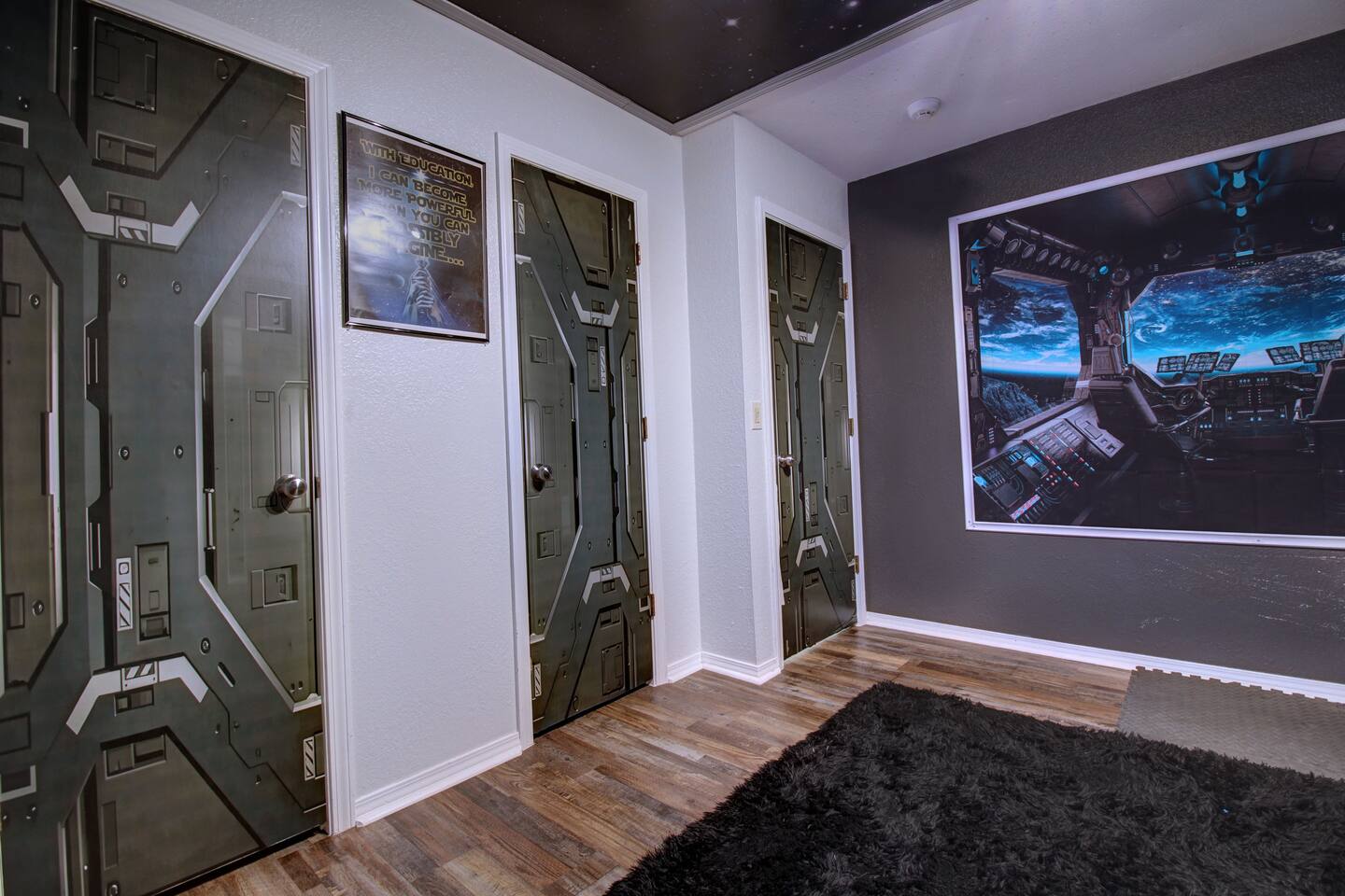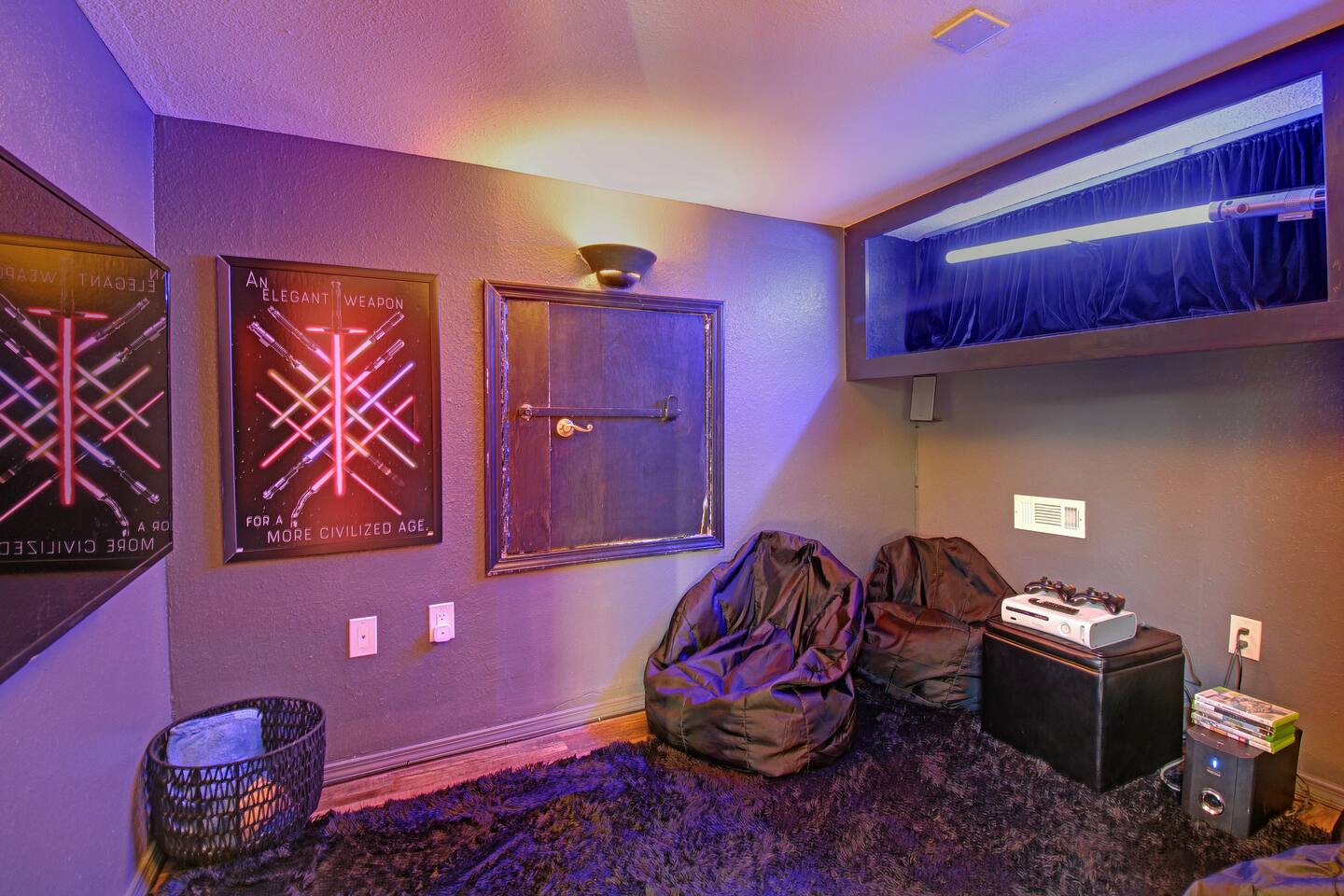 Whether you're craving rest or thrill, our unique, space-themed home is your perfect launchpad for an unforgettable adventure in Tulsa. Perfect for families, friend groups, and even your furry companions, this spacious retreat accommodates up to 9 stargazers. Inside, the galaxy comes to life with glowing decor and endless entertainment. Challenge your crew to a game of ping-pong or foosball in the game room, stage an epic Nerf battle, or unwind with your favorite movie in the cozy, themed movie room. For ultimate relaxation, soak in the jetted tub. The home is also equipped with fast Wi-Fi and a laptop-friendly workspace. Home Details: 2,110 Sq Ft | 3 Bedrooms | 2 Bathrooms Space-Themed Bedroom & Movie Room WFH Friendly Sleeping Arrangements: Bedroom 1: King Bed Bedroom 2: Queen Bed Bedroom 3: Triple Twin Bunk Bed Living Room: Sofa Additional sofas in garage and sun room. Two inflatable mattresses available upon request. Additional: Pack ‘n Play available Amenities: Entertainment: Smart TVs, gaming console, ping-pong table, foosball table, Nerf guns, board games, card games, giant box of Legos Comfort: Central heating & A/C, jetted bathtub, linens/towels, ceiling fans Convenience: Free WiFi, washer/dryer, keyless entry, iron/board, hair dryer, complimentary toiletries Family-Friendly: Pack ‘n Play, high chair, and other baby/toddler amenities, dog pen Kitchen: Fully equipped with refrigerator, stove, dishwasher, microwave, coffee maker, Crockpots, toaster, blender, cooking basics, dishware/flatware Outdoors: Private fenced yard, fire pit, outdoor dining area, furnished sunroom