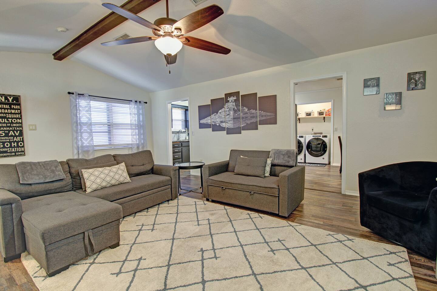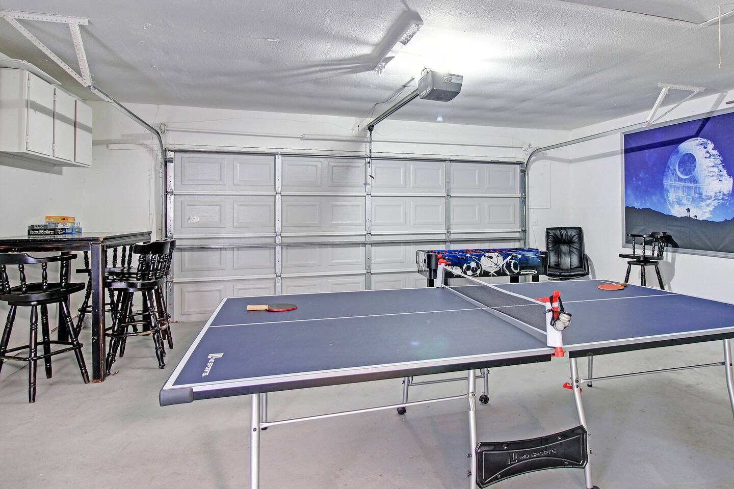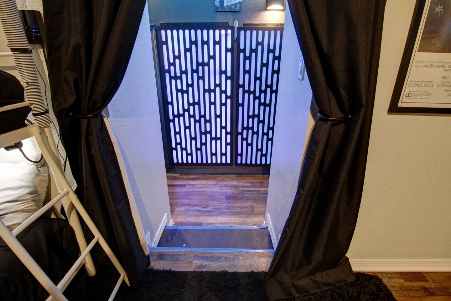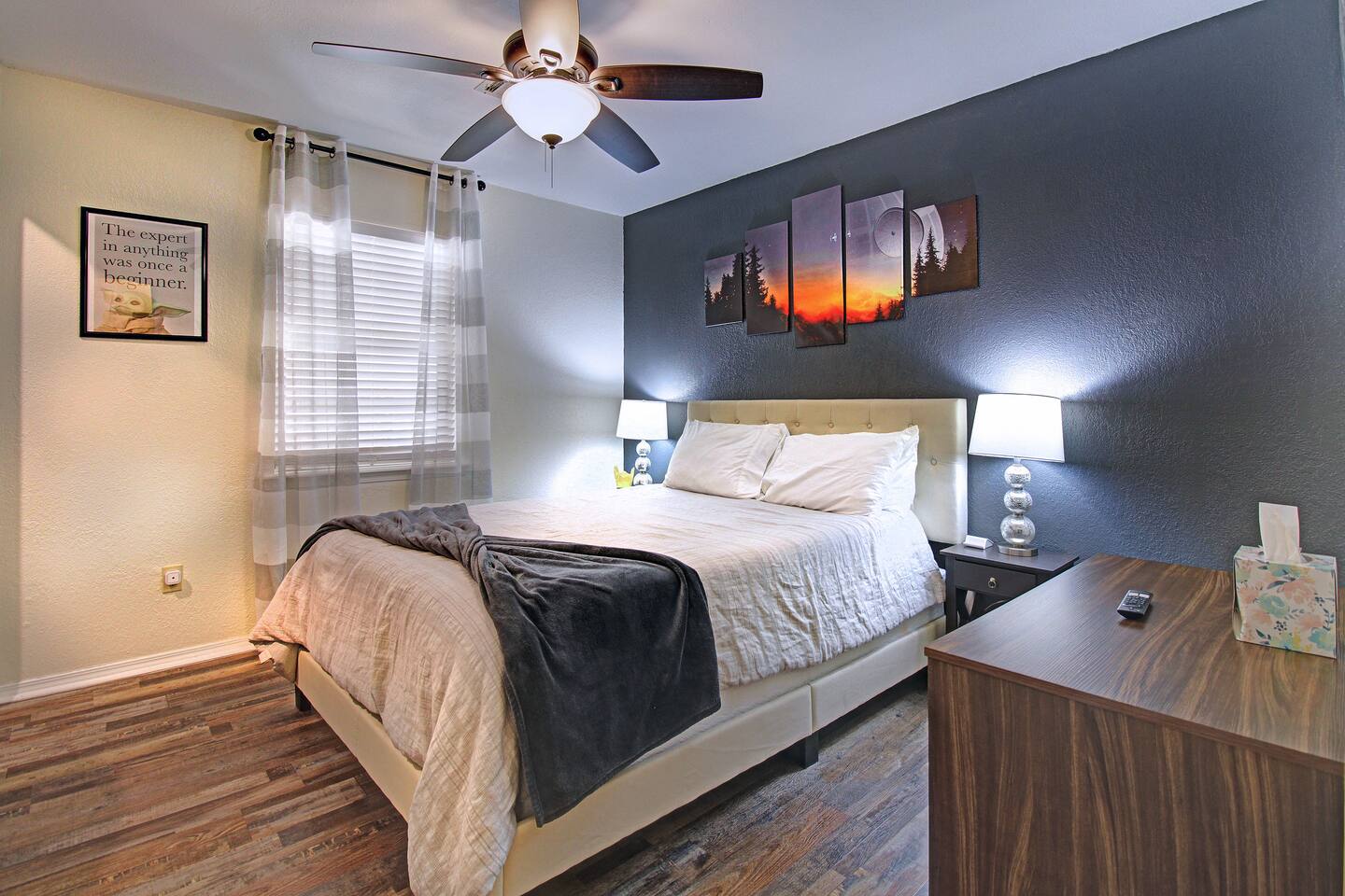 Whether you're craving rest or thrill, our unique, space-themed home is your perfect launchpad for an unforgettable adventure in Tulsa. Perfect for families, friend groups, and even your furry companions, this spacious retreat accommodates up to 9 stargazers. Inside, the galaxy comes to life with glowing decor and endless entertainment. Challenge your crew to a game of ping-pong or foosball in the game room, stage an epic Nerf battle, or unwind with your favorite movie in the cozy, themed movie room. For ultimate relaxation, soak in the jetted tub. The home is also equipped with fast Wi-Fi and a laptop-friendly workspace. Home Details: 2,110 Sq Ft | 3 Bedrooms | 2 Bathrooms Space-Themed Bedroom & Movie Room WFH Friendly Sleeping Arrangements: Bedroom 1: King Bed Bedroom 2: Queen Bed Bedroom 3: Triple Twin Bunk Bed Living Room: Sofa Additional sofas in garage and sun room. Two inflatable mattresses available upon request. Additional: Pack ‘n Play available Amenities: Entertainment: Smart TVs, gaming console, ping-pong table, foosball table, Nerf guns, board games, card games, giant box of Legos Comfort: Central heating & A/C, jetted bathtub, linens/towels, ceiling fans Convenience: Free WiFi, washer/dryer, keyless entry, iron/board, hair dryer, complimentary toiletries Family-Friendly: Pack ‘n Play, high chair, and other baby/toddler amenities, dog pen Kitchen: Fully equipped with refrigerator, stove, dishwasher, microwave, coffee maker, Crockpots, toaster, blender, cooking basics, dishware/flatware Outdoors: Private fenced yard, fire pit, outdoor dining area, furnished sunroom