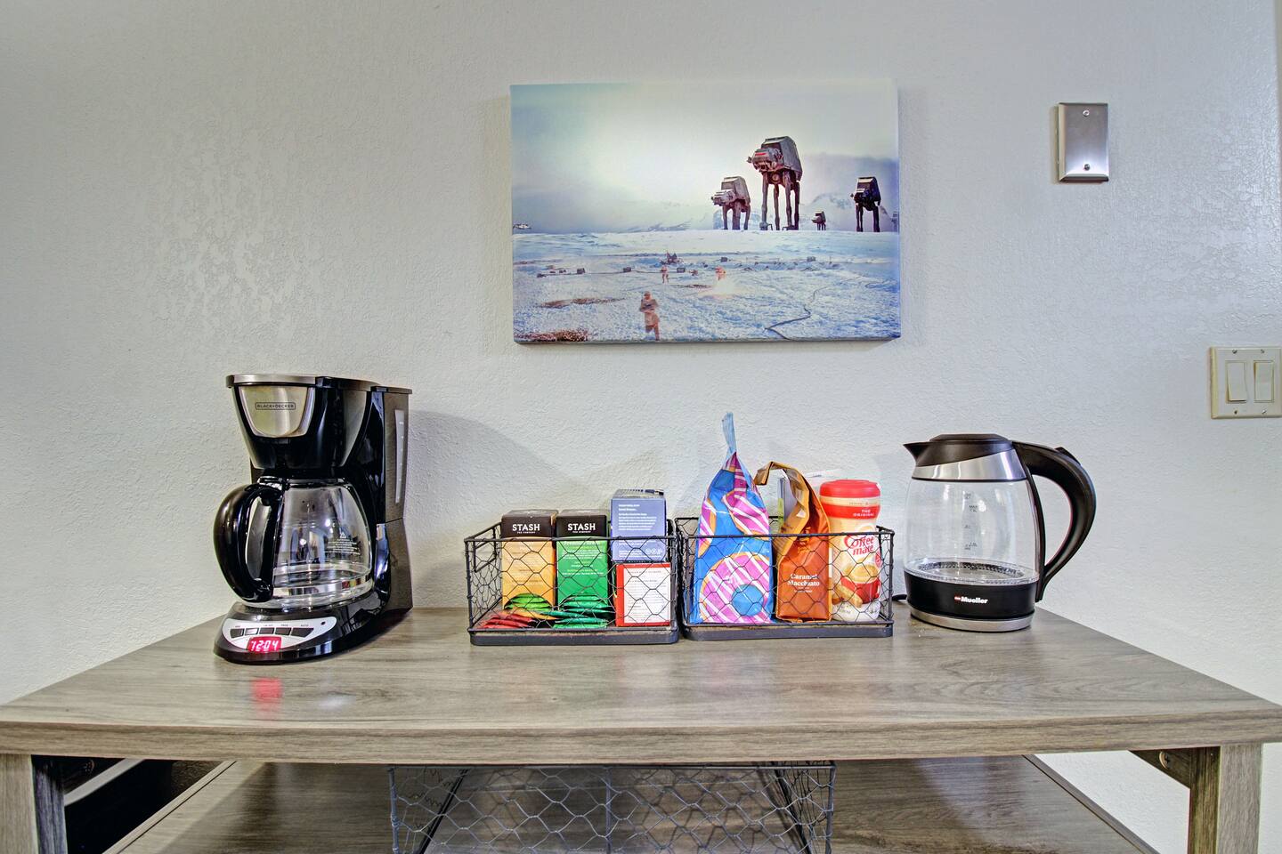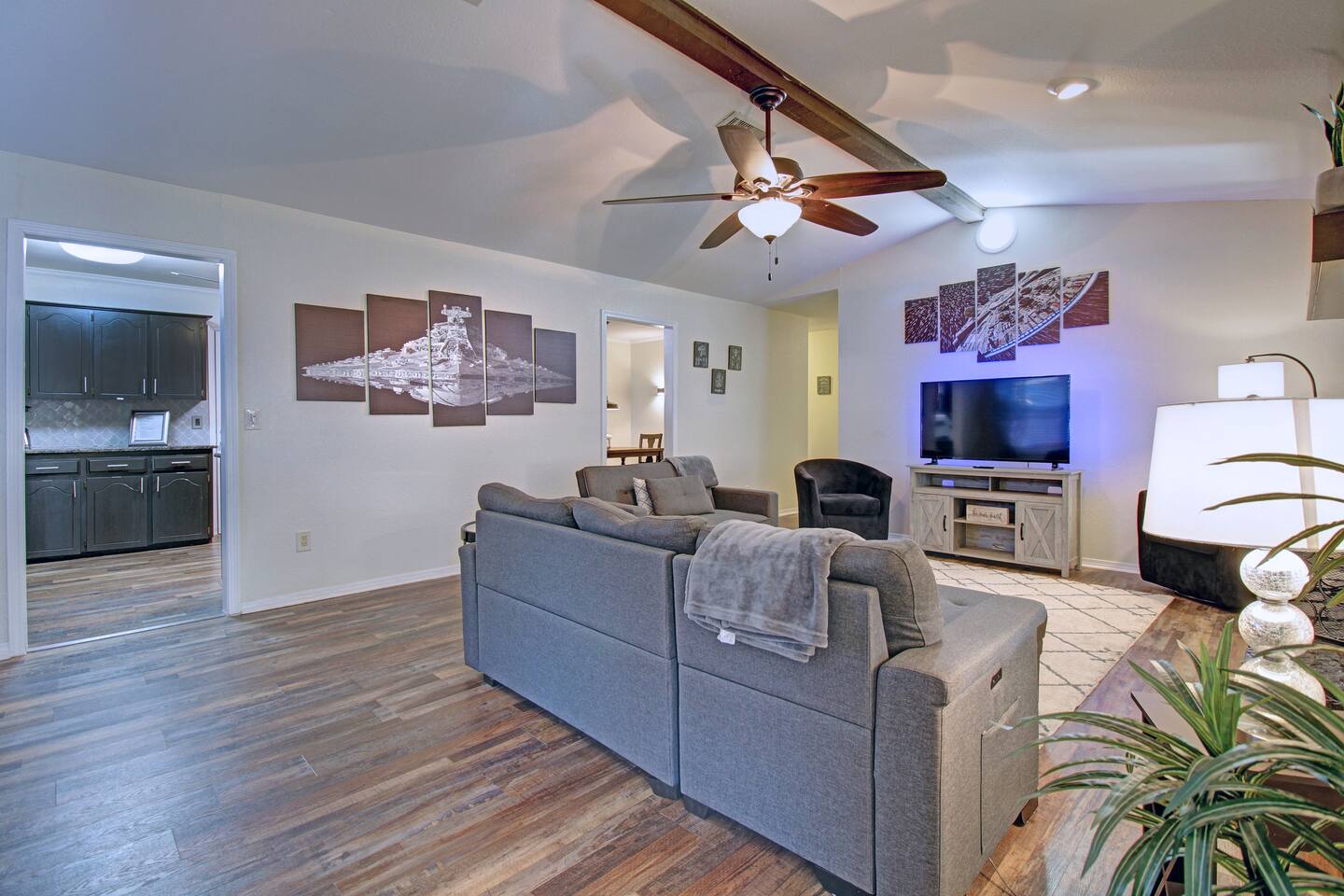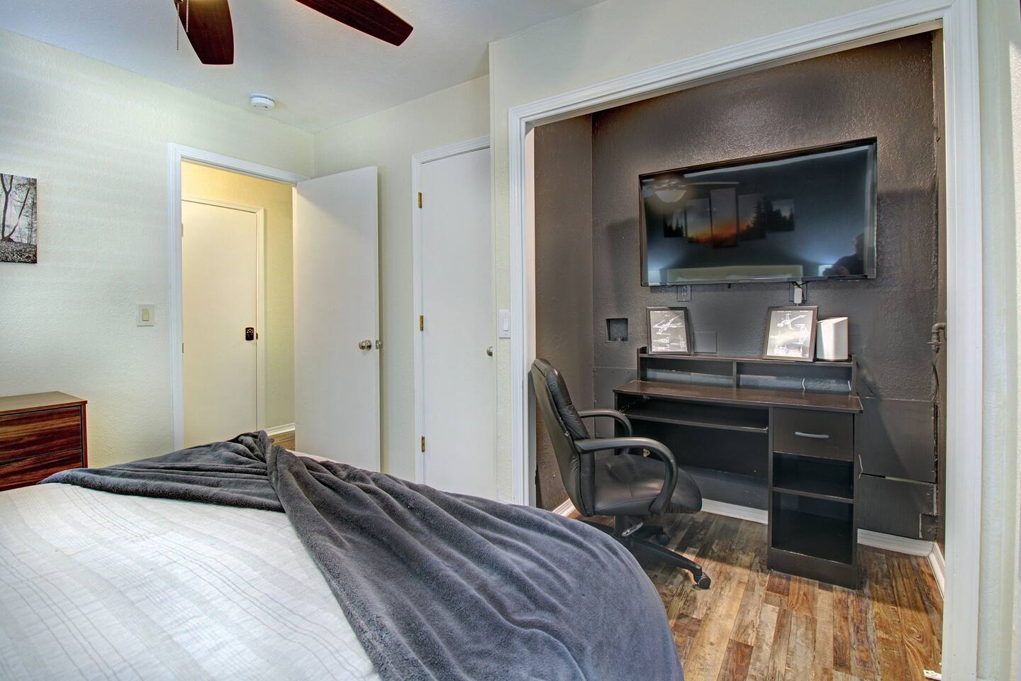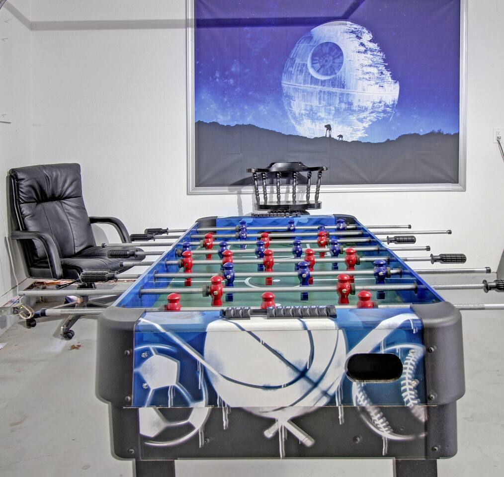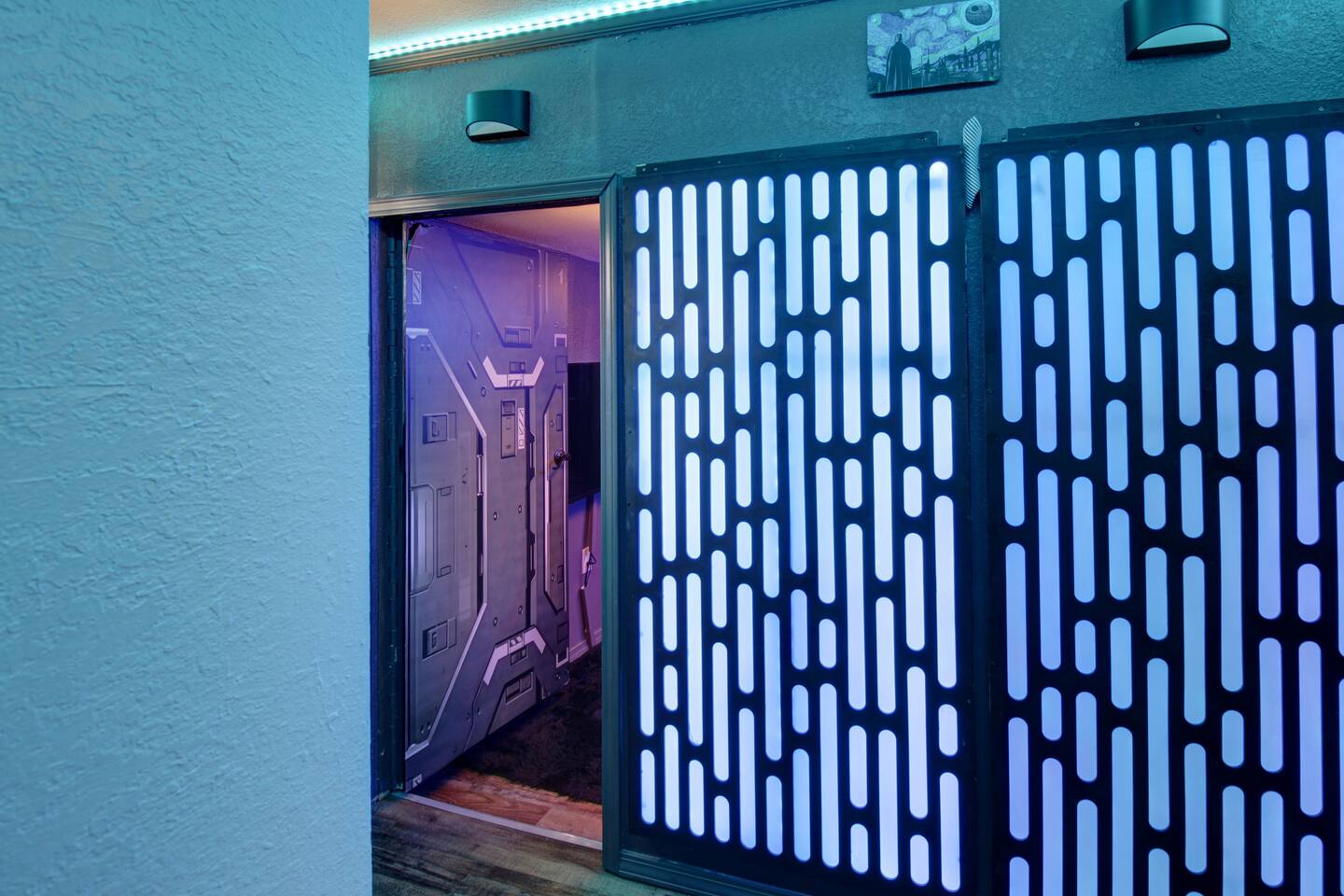 Whether you're craving rest or thrill, our unique, space-themed home is your perfect launchpad for an unforgettable adventure in Tulsa. Perfect for families, friend groups, and even your furry companions, this spacious retreat accommodates up to 9 stargazers. Inside, the galaxy comes to life with glowing decor and endless entertainment. Challenge your crew to a game of ping-pong or foosball in the game room, stage an epic Nerf battle, or unwind with your favorite movie in the cozy, themed movie room. For ultimate relaxation, soak in the jetted tub. The home is also equipped with fast Wi-Fi and a laptop-friendly workspace. Home Details: 2,110 Sq Ft | 3 Bedrooms | 2 Bathrooms Space-Themed Bedroom & Movie Room WFH Friendly Sleeping Arrangements: Bedroom 1: King Bed Bedroom 2: Queen Bed Bedroom 3: Triple Twin Bunk Bed Living Room: Sofa Additional sofas in garage and sun room. Two inflatable mattresses available upon request. Additional: Pack ‘n Play available Amenities: Entertainment: Smart TVs, gaming console, ping-pong table, foosball table, Nerf guns, board games, card games, giant box of Legos Comfort: Central heating & A/C, jetted bathtub, linens/towels, ceiling fans Convenience: Free WiFi, washer/dryer, keyless entry, iron/board, hair dryer, complimentary toiletries Family-Friendly: Pack ‘n Play, high chair, and other baby/toddler amenities, dog pen Kitchen: Fully equipped with refrigerator, stove, dishwasher, microwave, coffee maker, Crockpots, toaster, blender, cooking basics, dishware/flatware Outdoors: Private fenced yard, fire pit, outdoor dining area, furnished sunroom